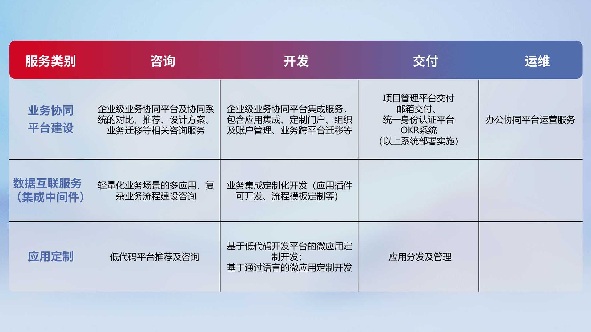 针对钉钉、、、企微、、、IDaas等平台级产品提供产品的规划、、方案、、交付、、、、定制化开发等服务,,实现如统一协同办公、、、、智能客户服务、、混合会议管理、、、、智能数据查询、、、、等业务场景,,实现数字化转型。。