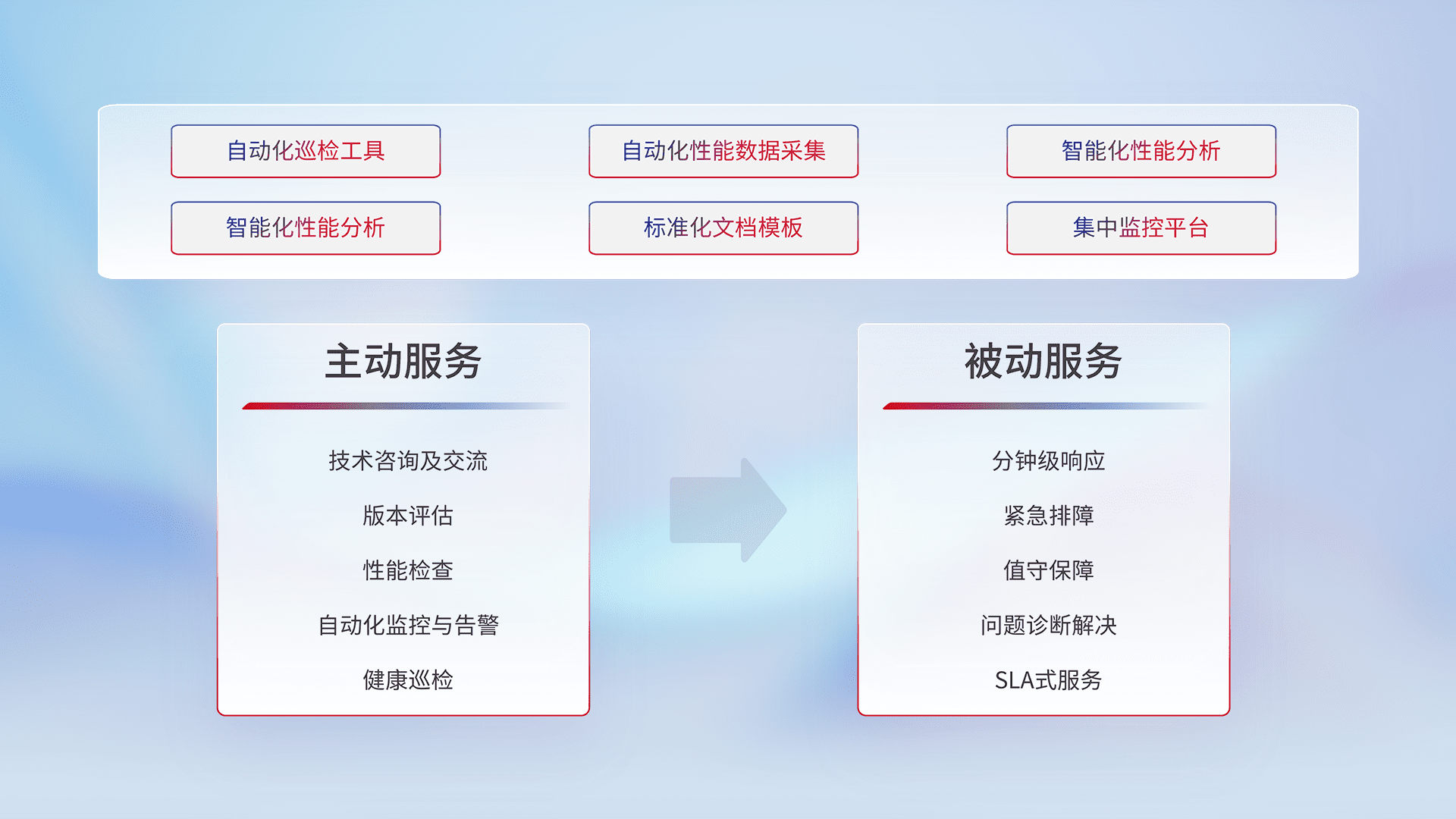 智能化工具和标准化文档,,,,保障服务质量,,,,提供主动服务(包含技术咨询、、、、版本评估、、、性能检查、、、、自动化监控与告警、、、、健康巡检)和被动服务包含(分钟级响应、、紧急排障、、值守保障、、问题诊断解决、、SLA服务)。。